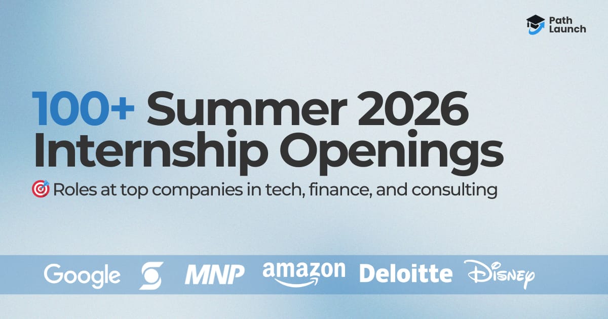 As a thank you for being part of the PathLaunch community, we put together something special. This week we are sharing a list of over 100 internships from top companies like Salesforce, GM, Uber, Manulife, and more.